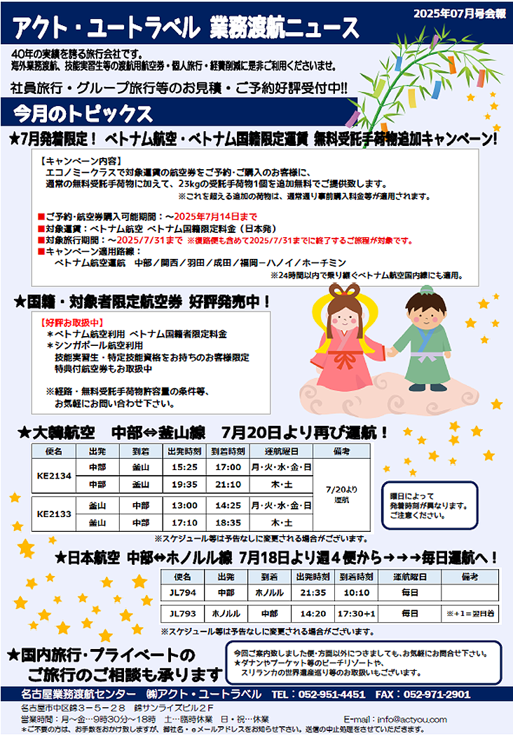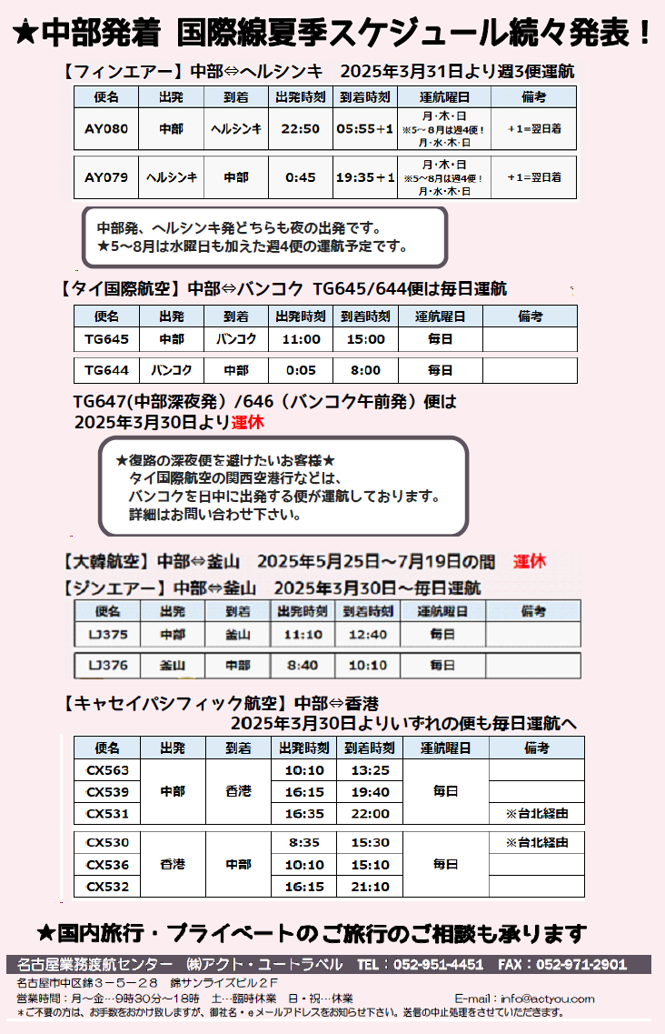 ジンAIRフライトスケジュール/2024/9~![]() ●ジンエアー名古屋ーソウル線 期間9/15~ スケジュール 【名古屋 ➡ ソウル】 【ソウル ➡ 名古屋】 LJ266 10:25➡12:35 LJ265 07:35➡09:25 LJ268 19:55➡22:00 LJ267 17:05➡18:55 ●ジンエアー 名古屋ー釜山線 9/14よりジンエアーの名古屋=釜山線の就航が決まりました スケジュール 【️名古屋 ➡ 釜山】 【釜山 ➡ 名古屋】 LJ376便 11:00-12:35 LJ375便 08:30-10:00 ※毎日運航 ❈期間:2024年9月14日~ (以降のスケジュールは決定次第ご案内致します。) ❈上記スケジュールは政府認可が条件となり、今後変更となる可能性がございます。 ❈セントレアは第1ターミナル発着です。 お問い合わせは (株)アクト・ユートラベル ☎ 052-951-4451 問合せフォームはこちら☞ |